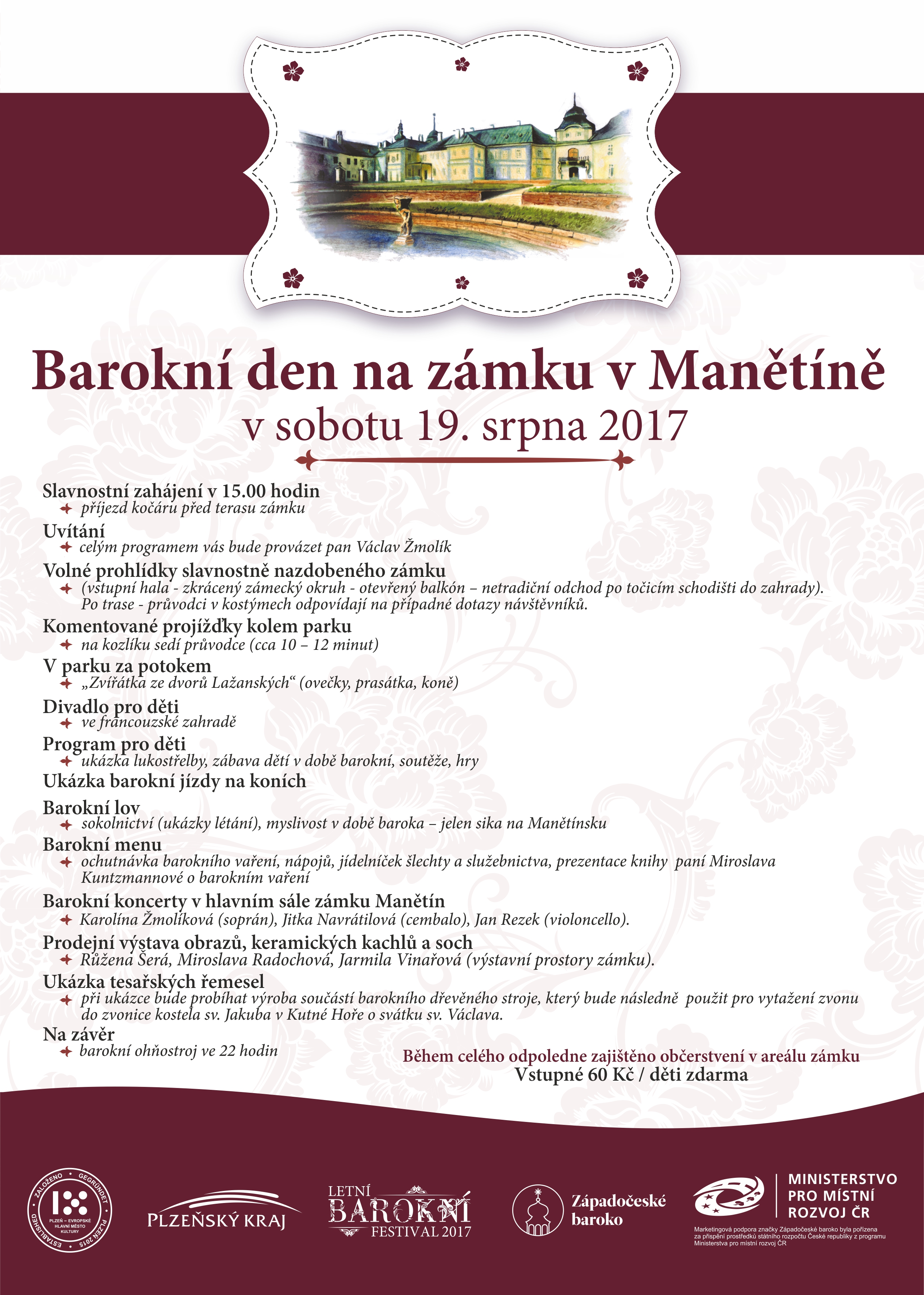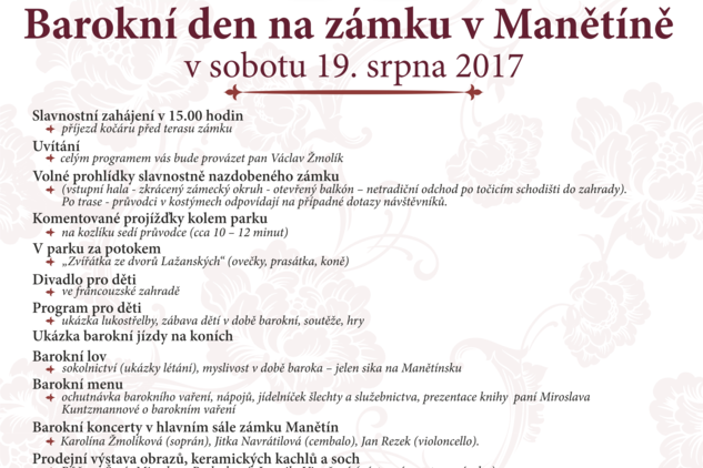Letní barokní festival 2017 vyvrcholí Barokním dnem pro celou rodinu na zámku Manětín v sobotu 19. srpna od 15:00 do 22:30 hodin. Celým dnem provází oblíbený moderátor Václav Žmolík